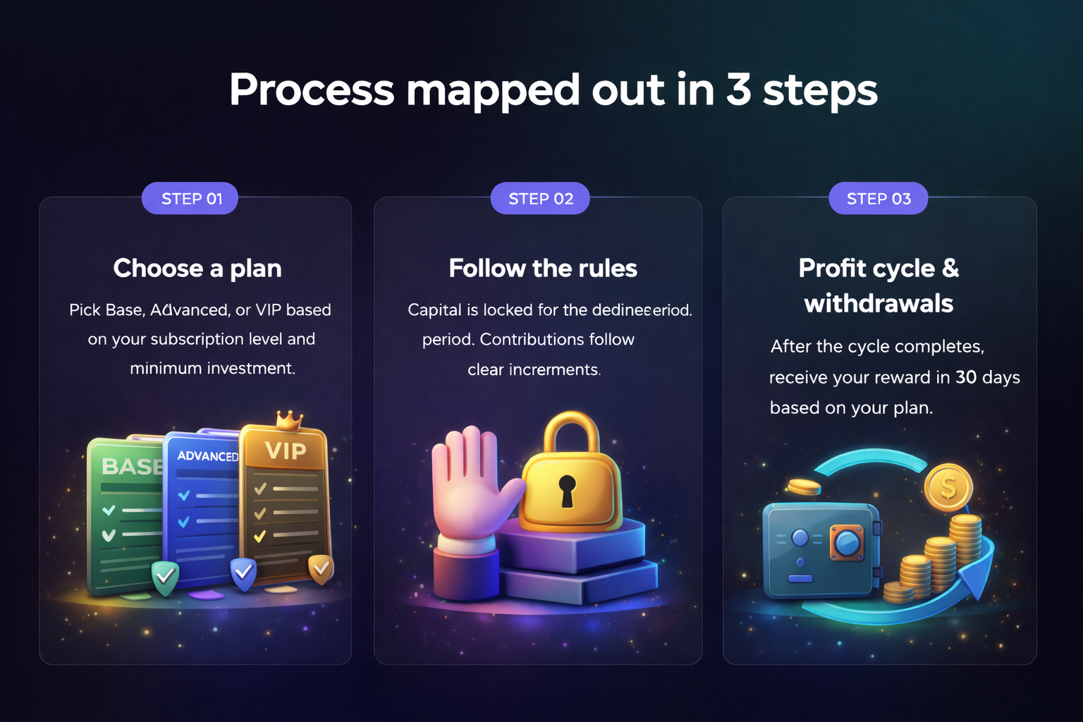 REGORIXA provides a structured participation framework built around capital discipline, transparent operating rules, and risk-aware execution. Instead of short-term speculation, the model focuses on predefined cycles, clear entry requirements, and documented processing timelines. All participation involves market risk and outcomes are variable — however, structure helps reduce emotional decision-making and improves operational clarity. Explore our plans and review Insights for research-style explanations on participation mechanics, lock periods, and capital protection principles.